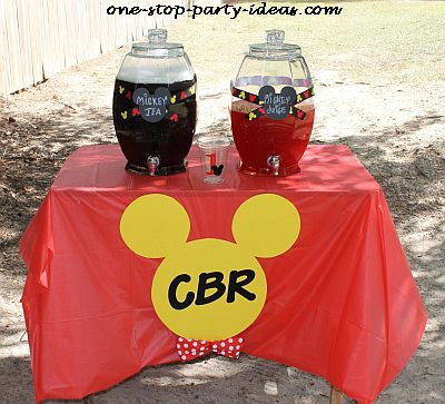 Design a beverage station that's all about Mickey. The dispensers, cups, and sippy cups drink in the Mickey birthday theme. The large cutout brings in bold color while proudly displaying the birthday boy's initials.