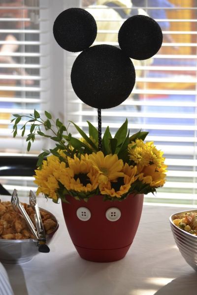 Flowers stand alone beautifully, but paying special attention to the presentation can pay off in a big way. Here, a Mickey Mouse pick and button embellished flower pot contribute to the playfulness of the centerpiece. It is best to stick to one color of flowers even if you mix the types of flowers.