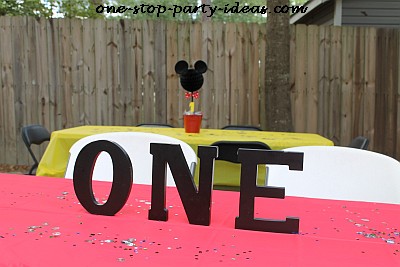 This Mickey Mouse honeycomb decoration was originally a hanging decoration. We snipped off the string, inserted a wooden dowel, and placed in a red pail containing Styrofoam. The fun factor came in the form of a red polka dotted bow tie attached with a red pipe cleaner and a festive yellow number 1 leaned against the dowel. Nothing completes a kid friendly centerpiece like candy.